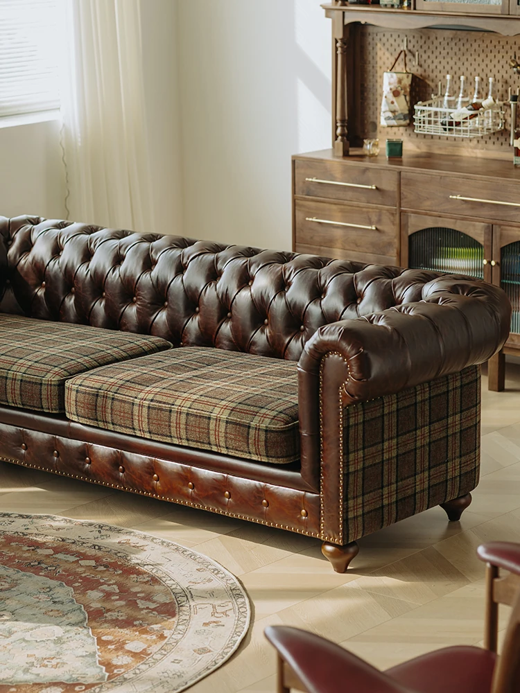 マンフィールドオイルワックスレザーソファー - ヴィンテージアメリカンスタイルの3人掛け本革ソファー、クラシックなイギリスのチェック柄でおしゃれなリビングにぴったり!
