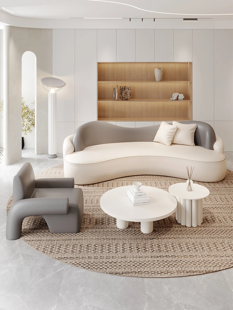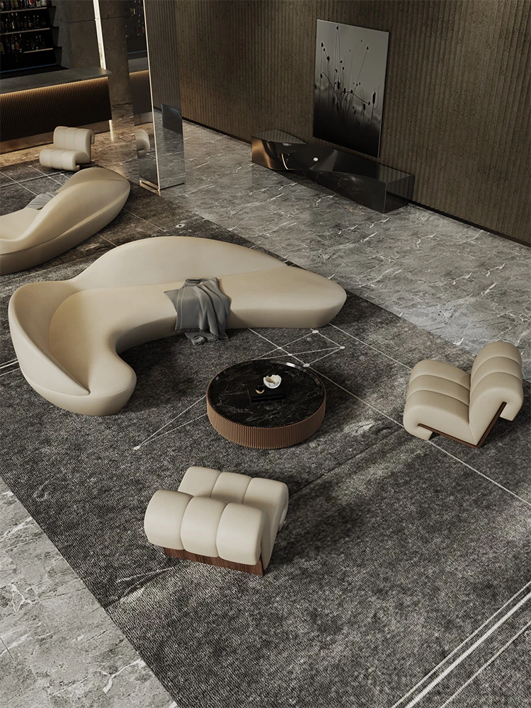 曲線美のユニークなソファ、ラグジュアリーな雰囲気を演出する休憩エリア。ホテルのロビーや民宿、女性服飾店、美容院に最適な洗練されたデザイン。お客様を優雅にお迎えします。