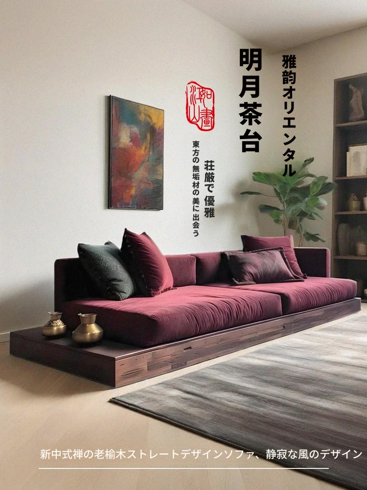 新中式の侘び寂び風レトロ無垢材ソファ|直置き・休憩スペース・接客用・茶室・会議用・民宿・ホテル・オフィスに最適!心落ち着く和の空間を演出します。