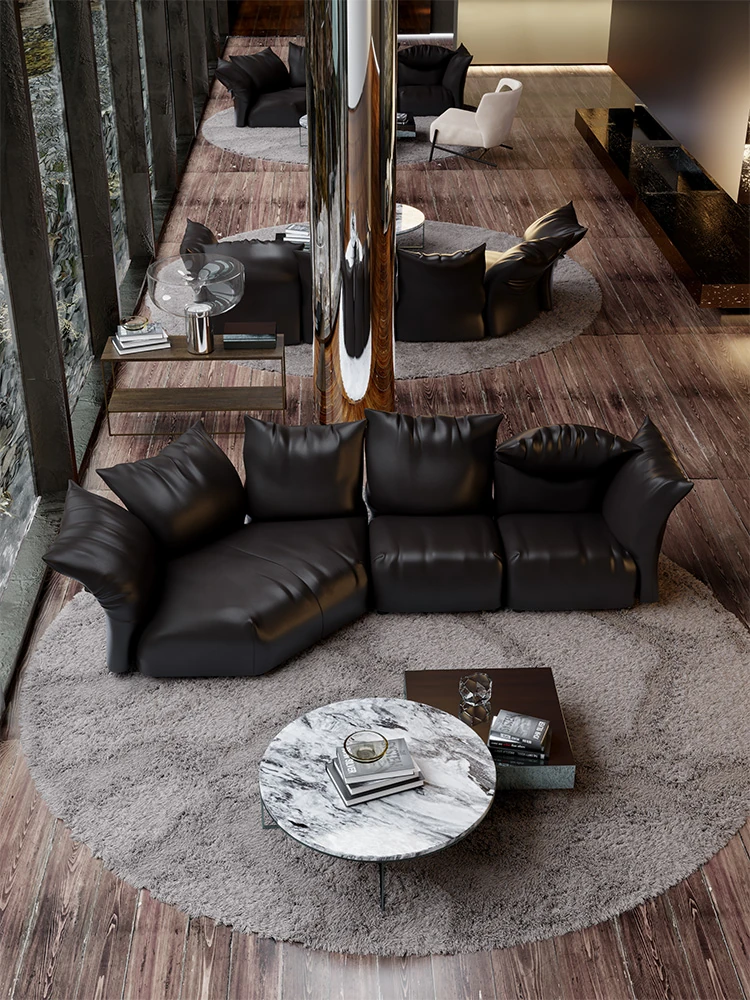 ラウンドソファー型のユニークなラウンジスペース - 高級感あふれるホテルのロビーや販売所、クラブ、オフィスの会談用に最適!おしゃれで居心地の良い空間を演出します。