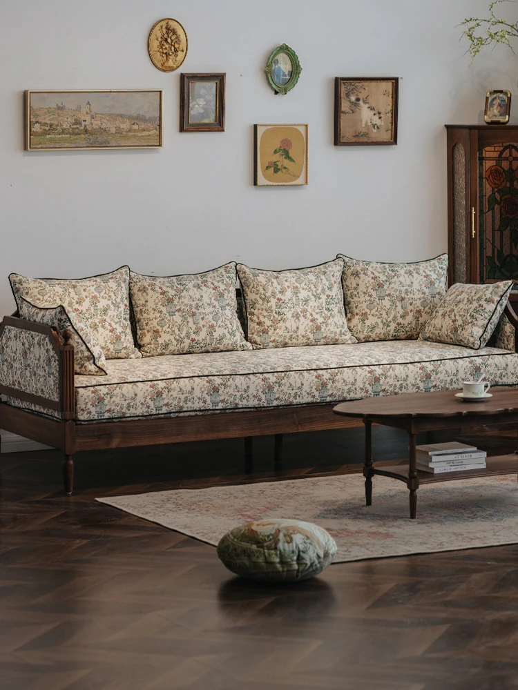 清新で美しい花鳥デザインの実木ソファ|レトロな三人掛け|布製&ブラックウォールナット材|小さなスペースにも最適な北欧スタイルのリビング家具!