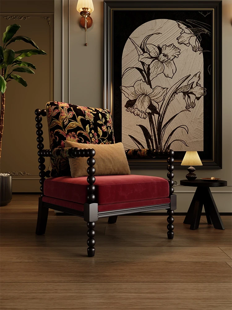 フレンチスタイルのブラックパールチェア|レトロで高級感溢れる無垢材製の一人掛けソファ|リビングに最適なデザイナー虎椅子|くつろぎのひとときを演出します。