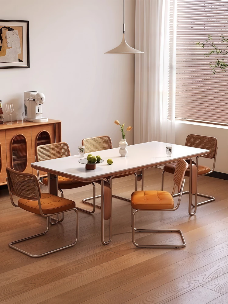 モビエンレトロダイニングテーブルセット - 小型スペースにぴったりな長方形の実木&ロックストーン製の大板テーブル。スタイリッシュなデザインで、食事の時間を特別に演出します!