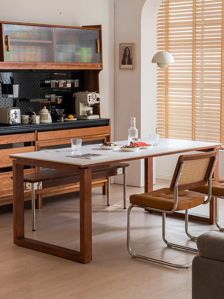北欧スタイルの無垢材ロックボードダイニングテーブル - チェリーベースの小型和風家庭用ロングテーブル、ナチュラルな大板デザインでおしゃれな食卓を演出!