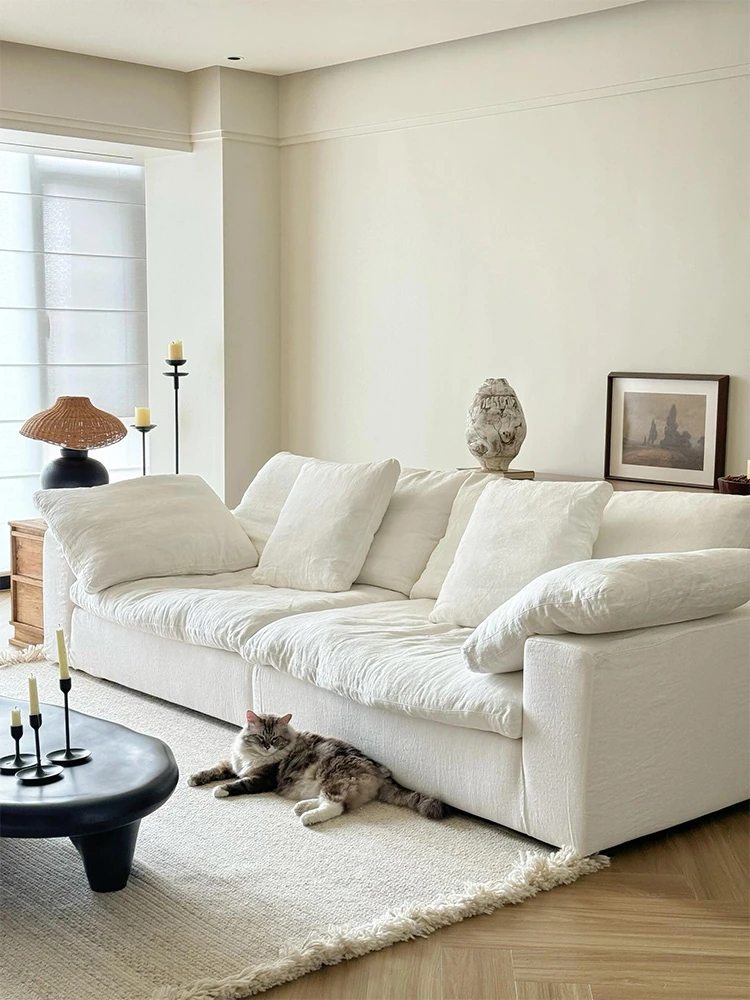 Dongguan Longjiang Wabi-Sabi Style Modern Cream Upholstered Sofa – Removable and Washable Cotton-Linen Modular Cloud Sofa for a Cozy Living Room, Featuring Down Filling for Ultimate Comfort