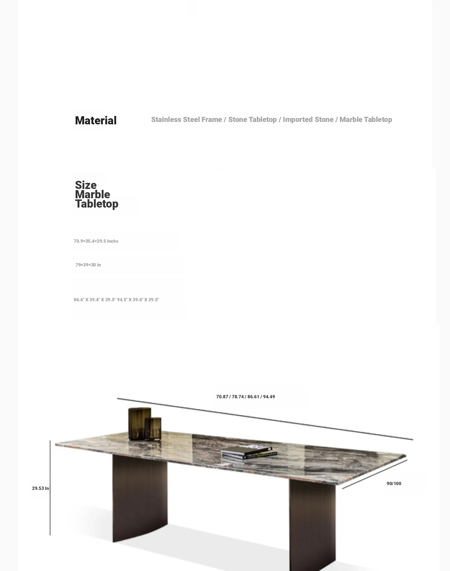 70.87 in dining table (Import rock plate/stainless steel frame)