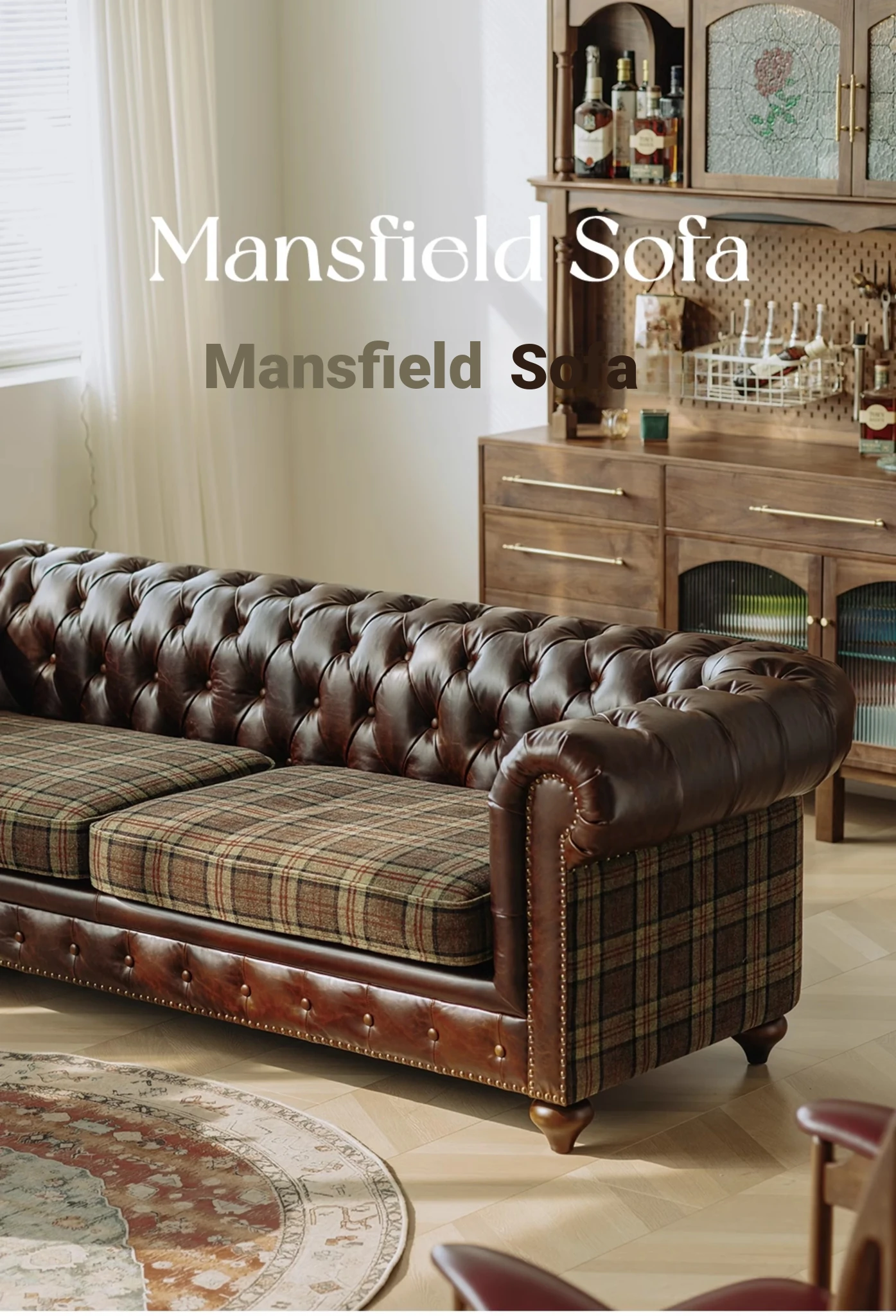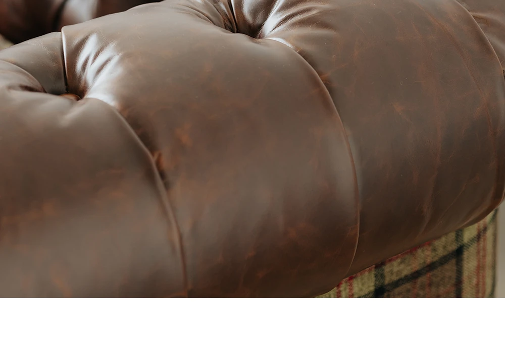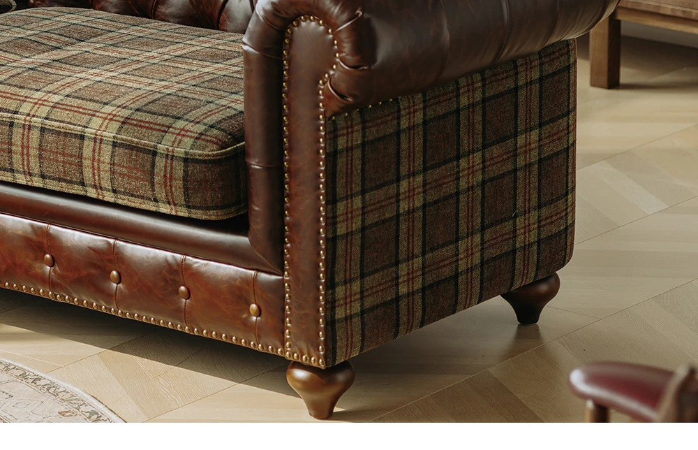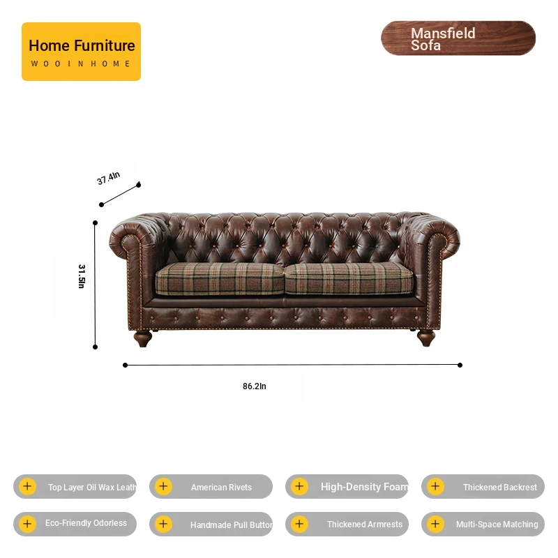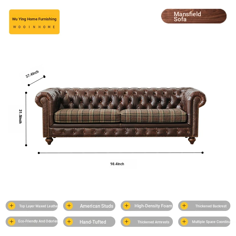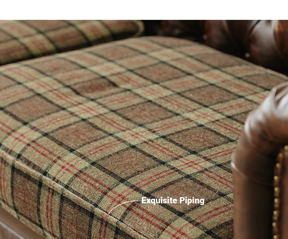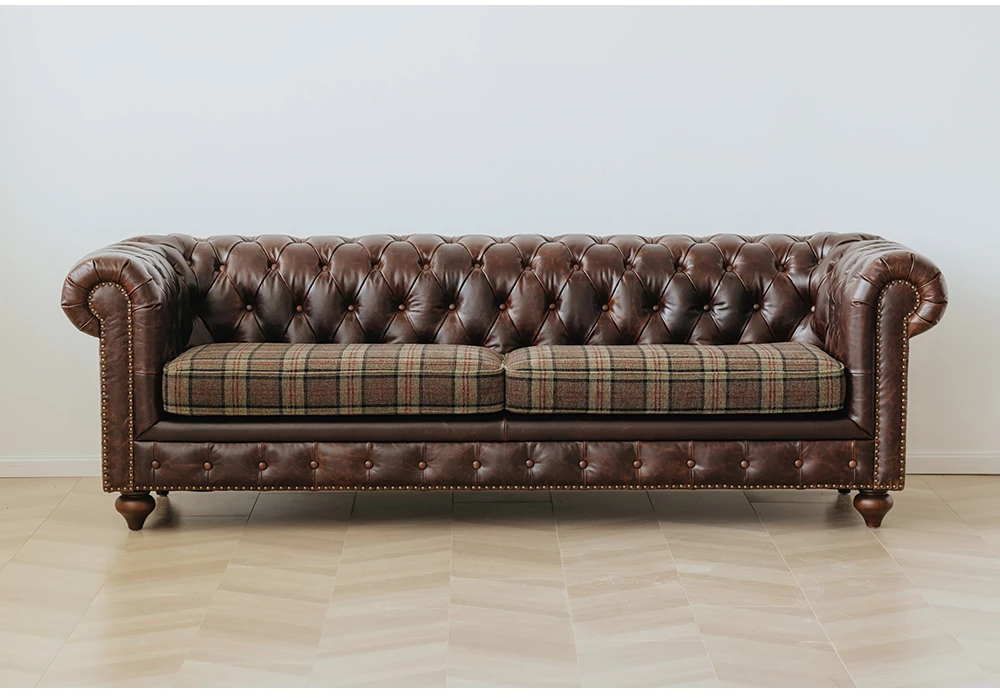 Mansfield Vintage Waxed Leather Sofa - Retro American Style 3-Seater Genuine Leather Couch for Living Room - Classic British Check Design