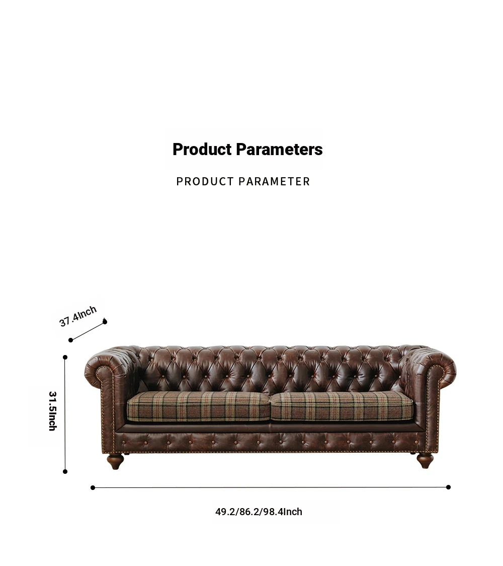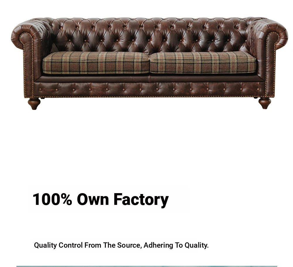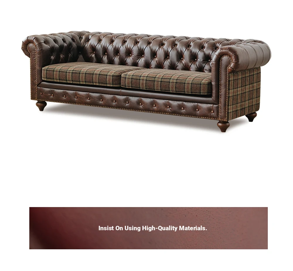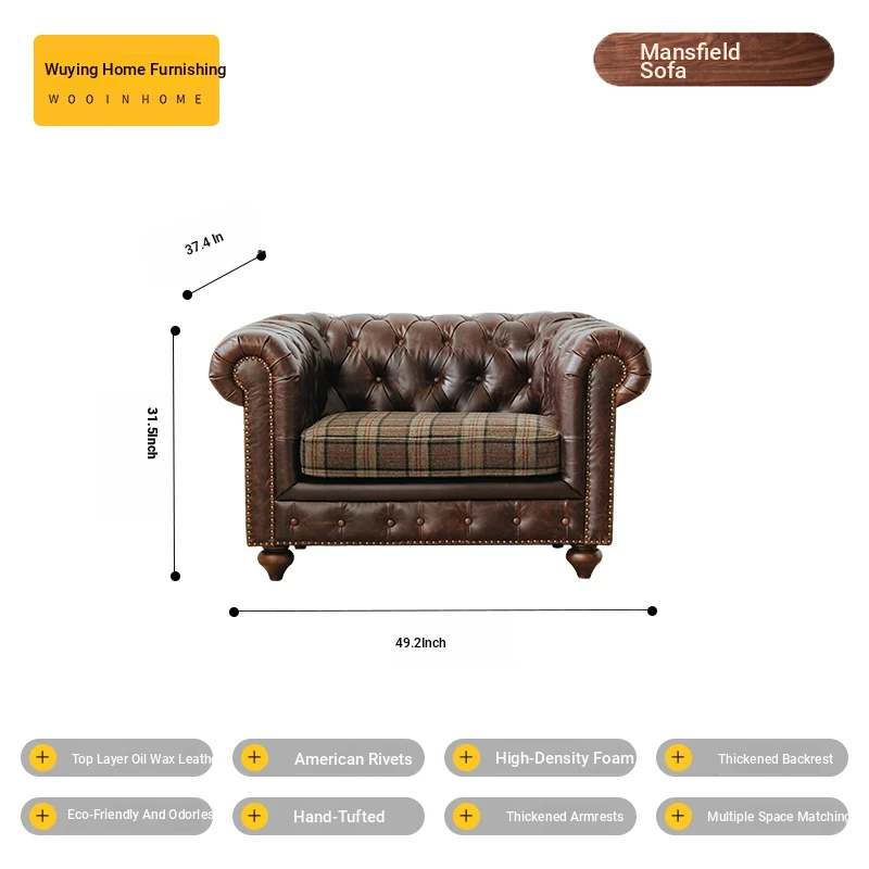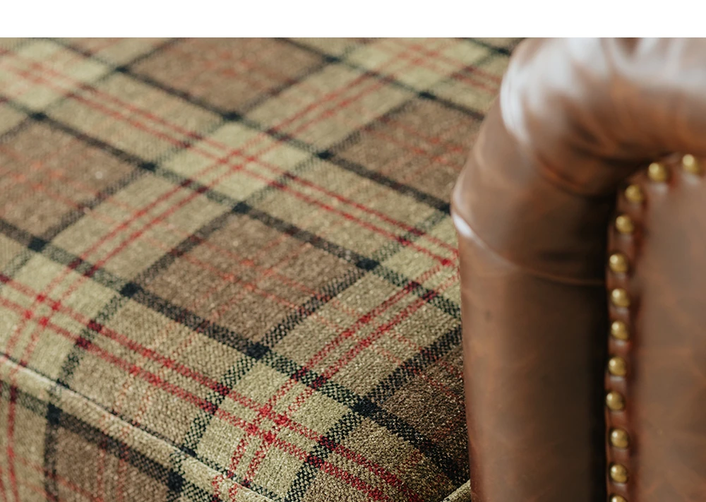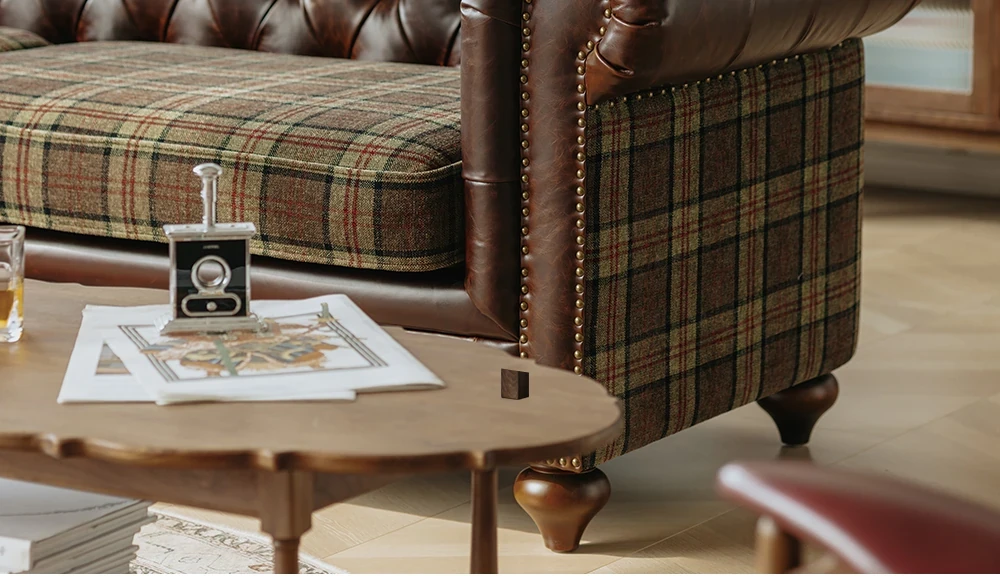 Mansfield Vintage Waxed Leather Sofa - Retro American Style 3-Seater Genuine Leather Couch for Living Room - Classic British Check Design