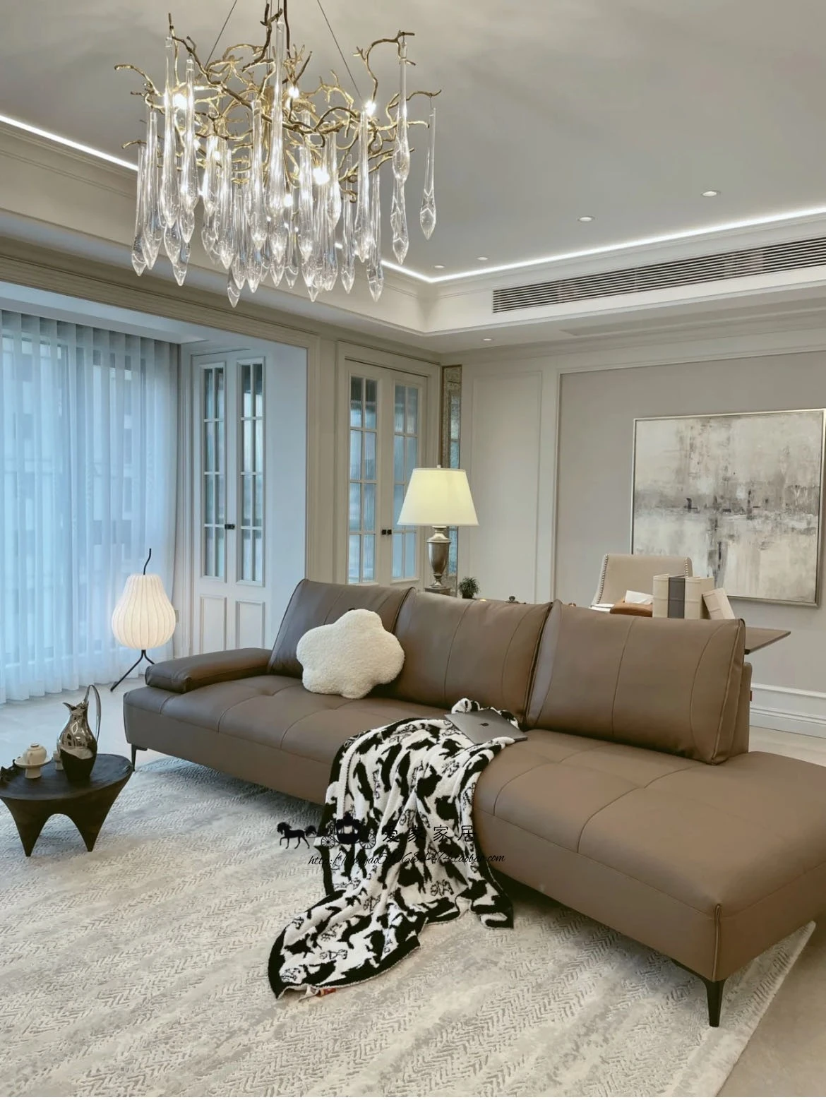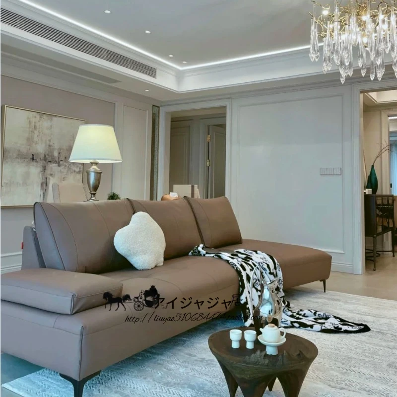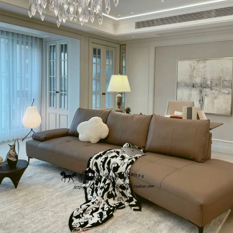 アメリカンシンプルファブリックソファ - ラグジュアリーでおしゃれな別荘リビングにぴったり!ロールスロイスのような本革直排コンビネーションソファで、快適さとスタイルを両立。おしゃれな空間を演出します!