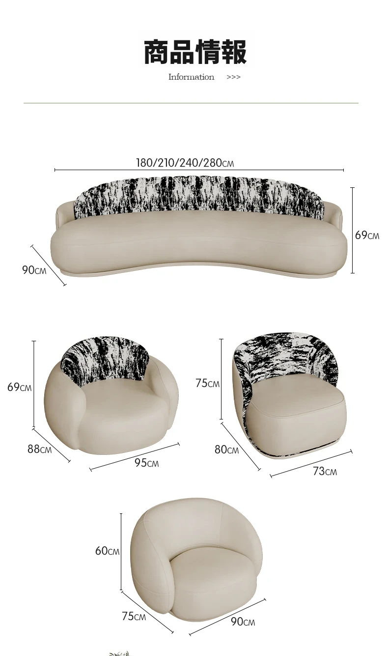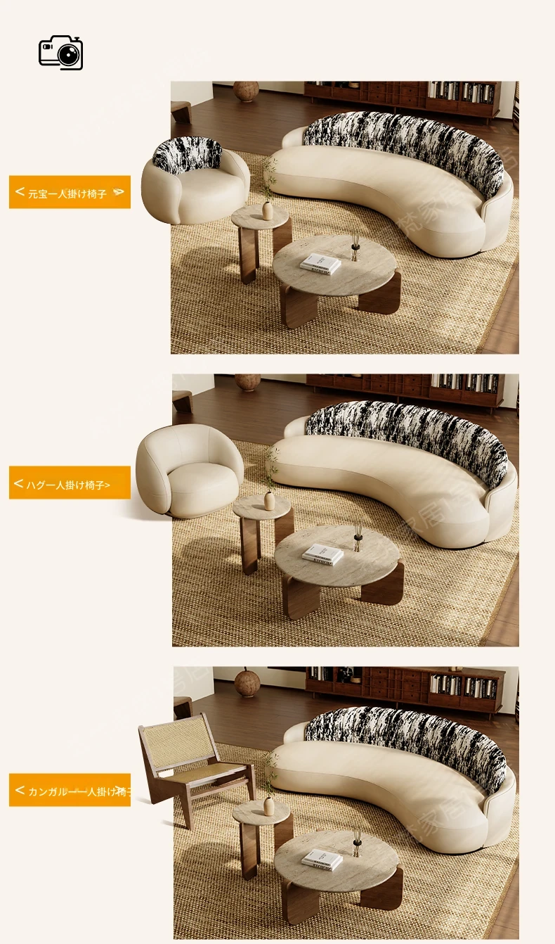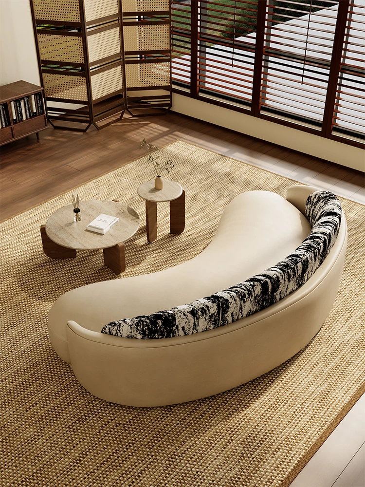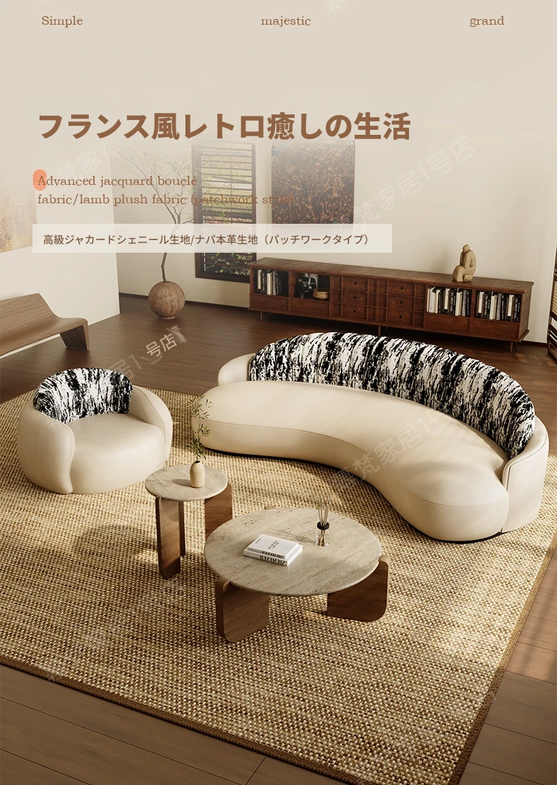 曲線美のユニークなソファ、ラグジュアリーな雰囲気を演出する休憩エリア。ホテルのロビーや民宿、女性服飾店、美容院に最適な洗練されたデザイン。お客様を優雅にお迎えします。