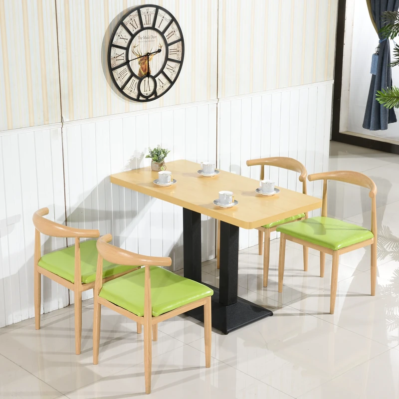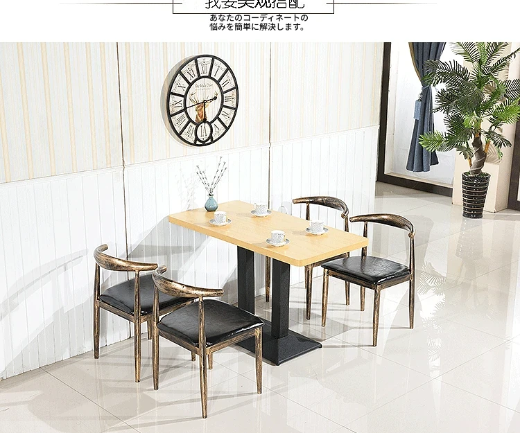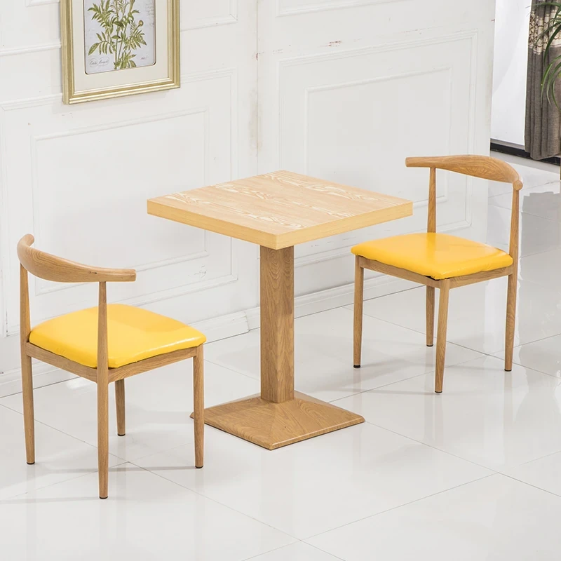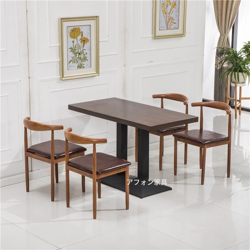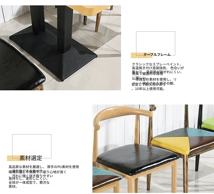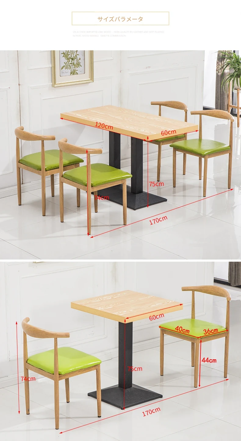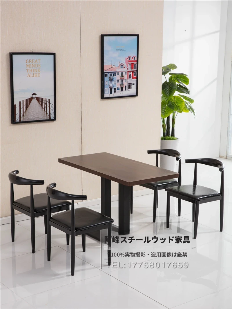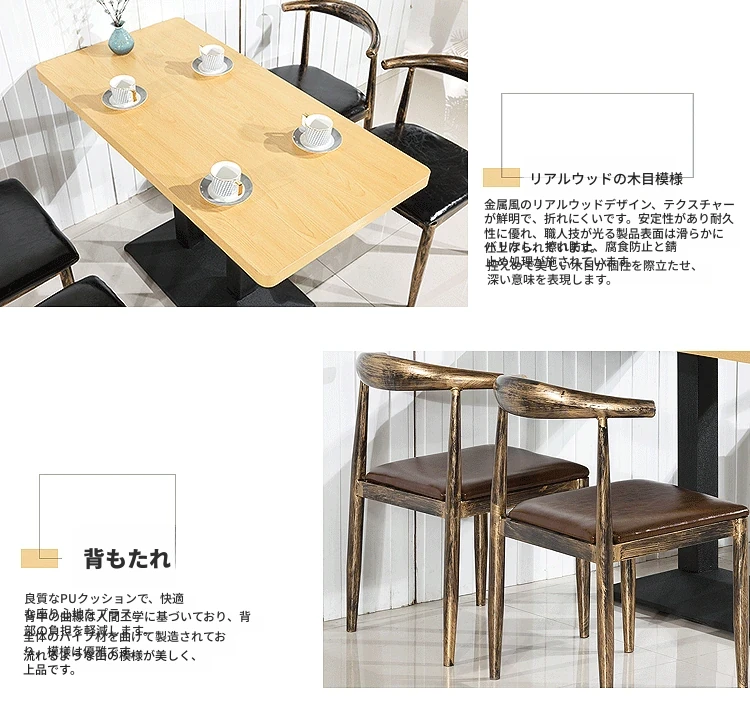 鉄製バッファローチェアの模造木製デザイン、シンプルでスタイリッシュなダイニングテーマ、カフェやレストランに最適!ファーストフードやホットポット、ティーショップにもぴったりなテーブルチェアセット!