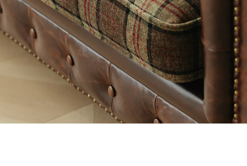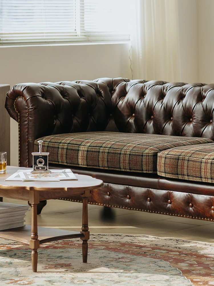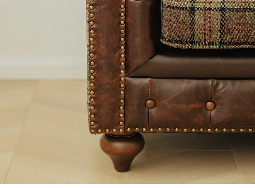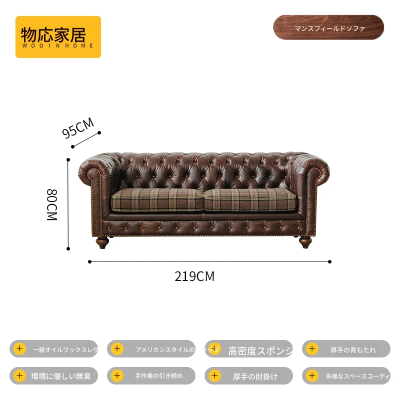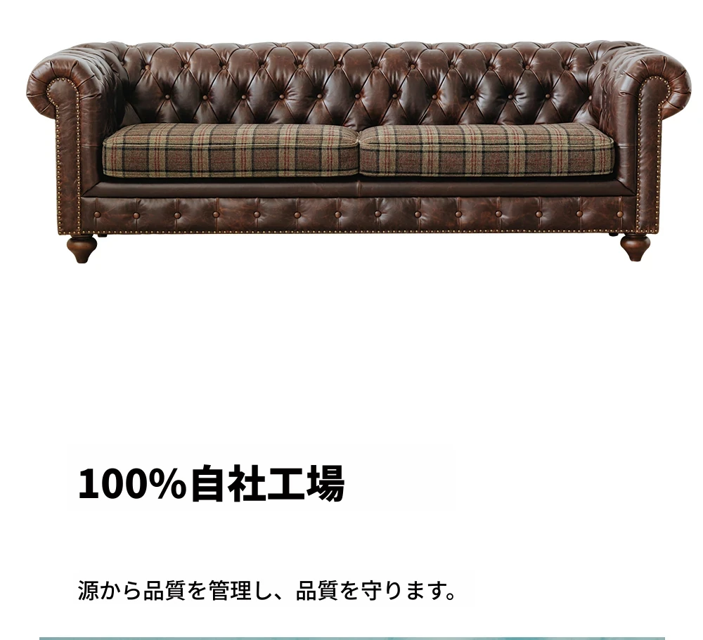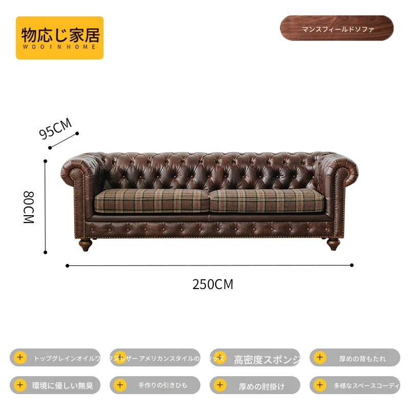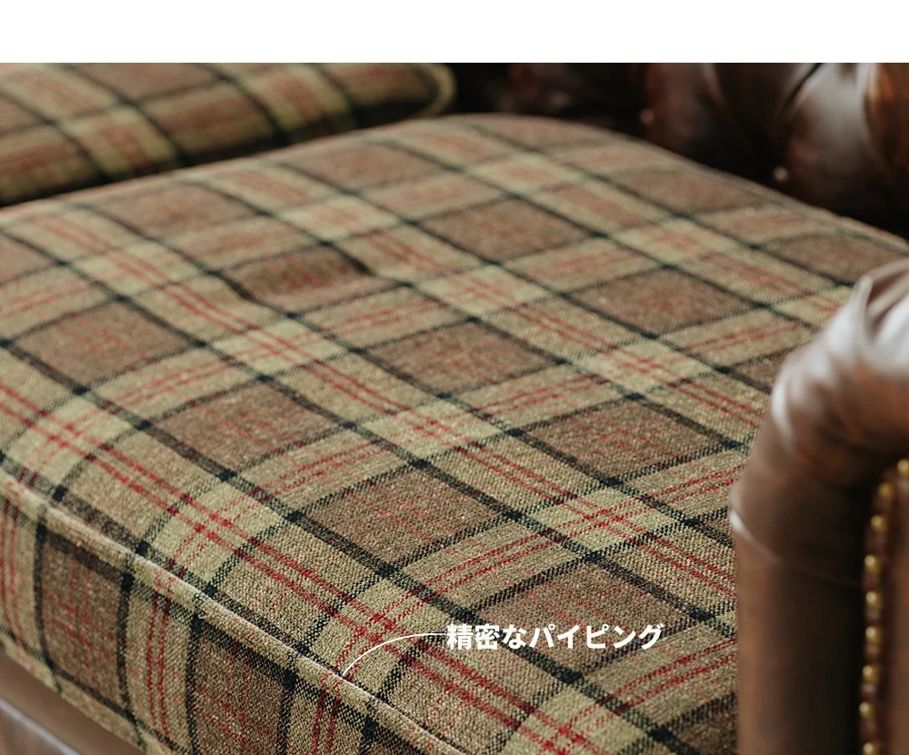 マンフィールドオイルワックスレザーソファー - ヴィンテージアメリカンスタイルの3人掛け本革ソファー、クラシックなイギリスのチェック柄でおしゃれなリビングにぴったり!