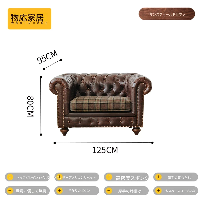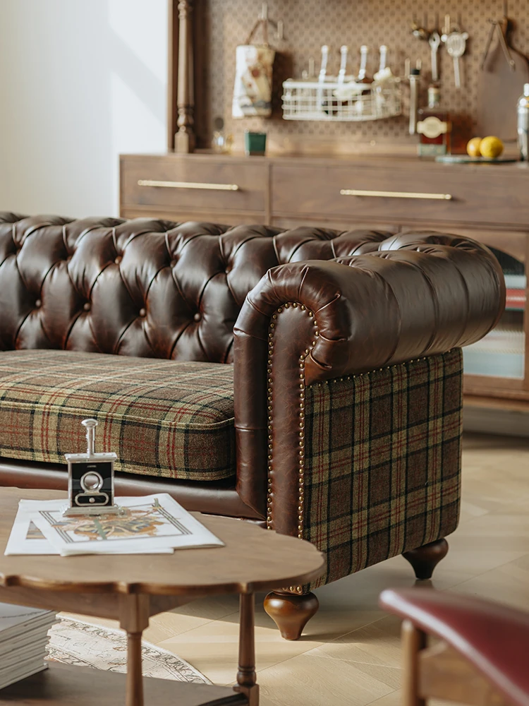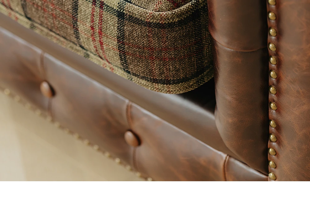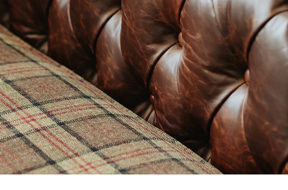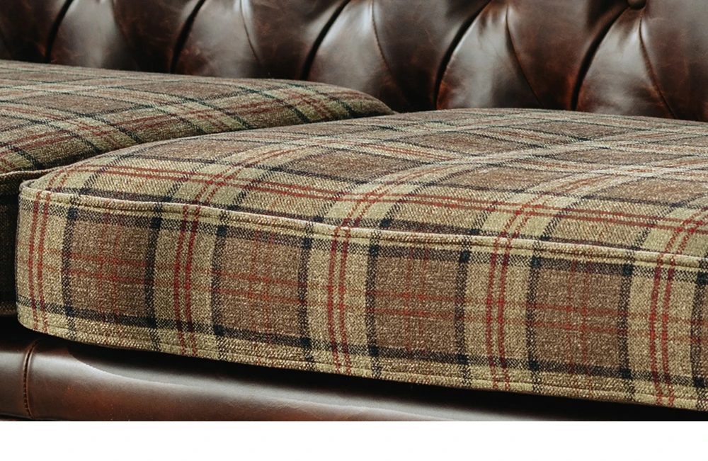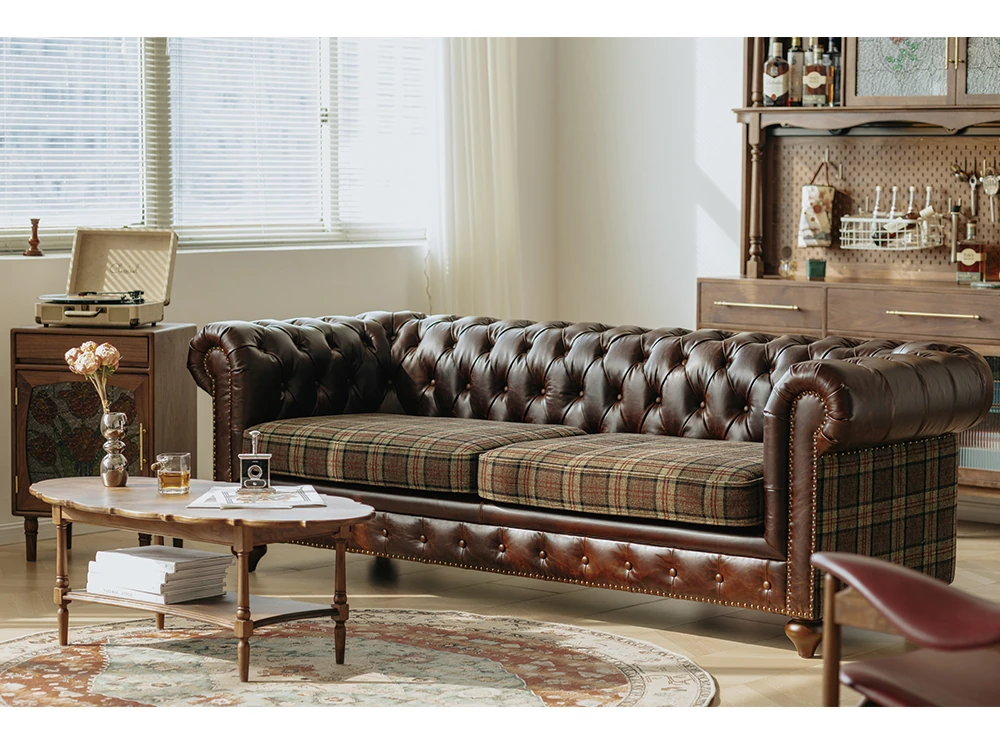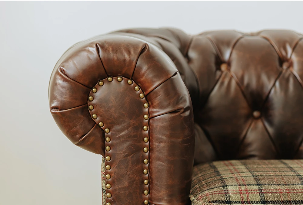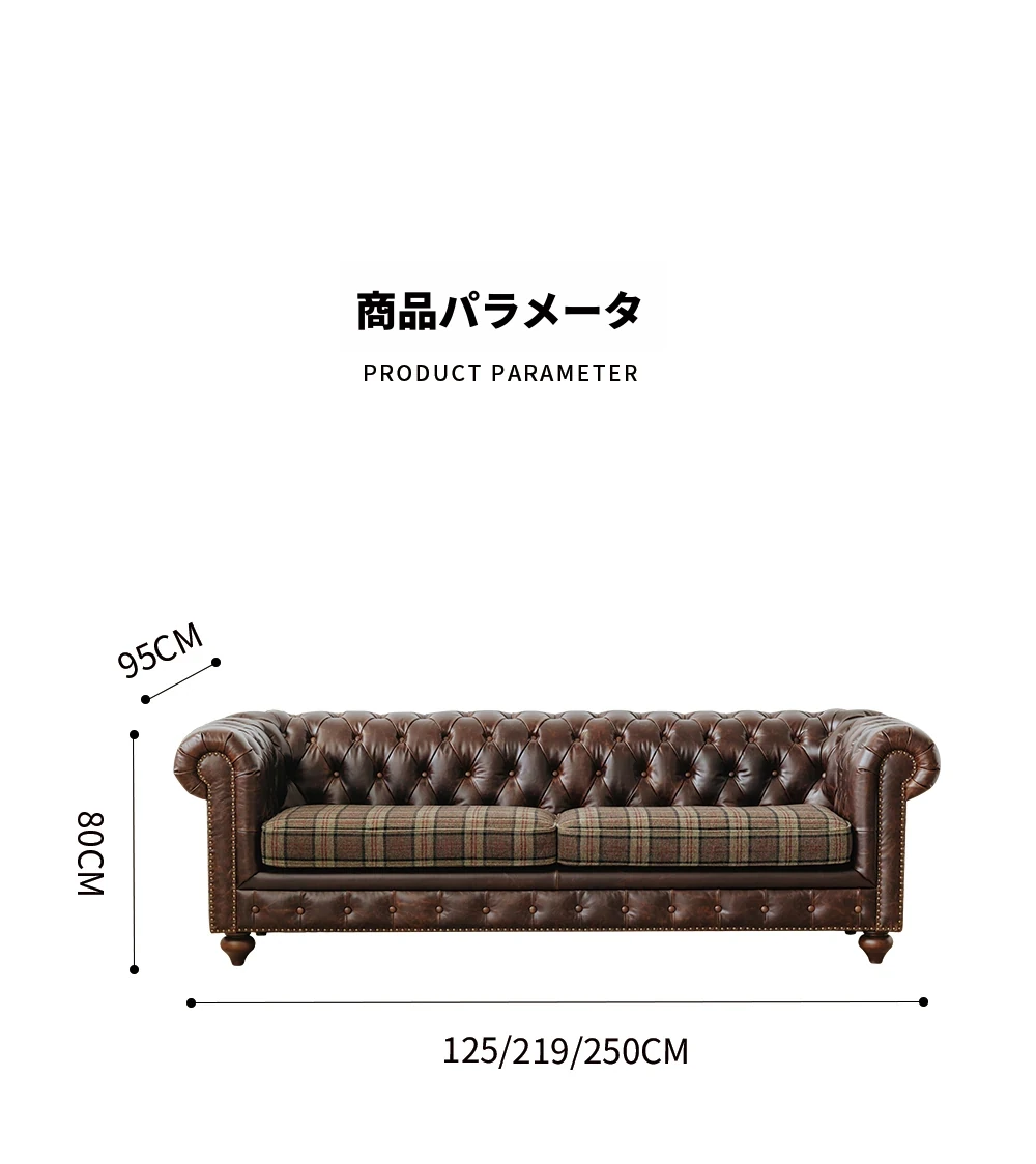 マンフィールドオイルワックスレザーソファー - ヴィンテージアメリカンスタイルの3人掛け本革ソファー、クラシックなイギリスのチェック柄でおしゃれなリビングにぴったり!