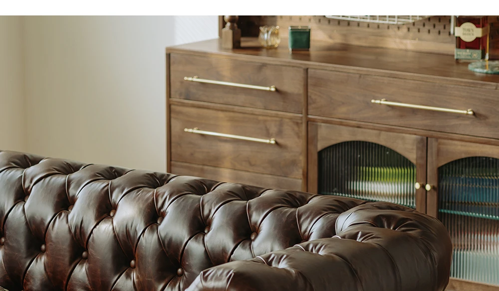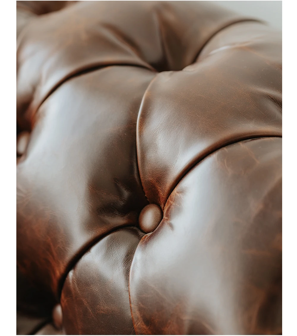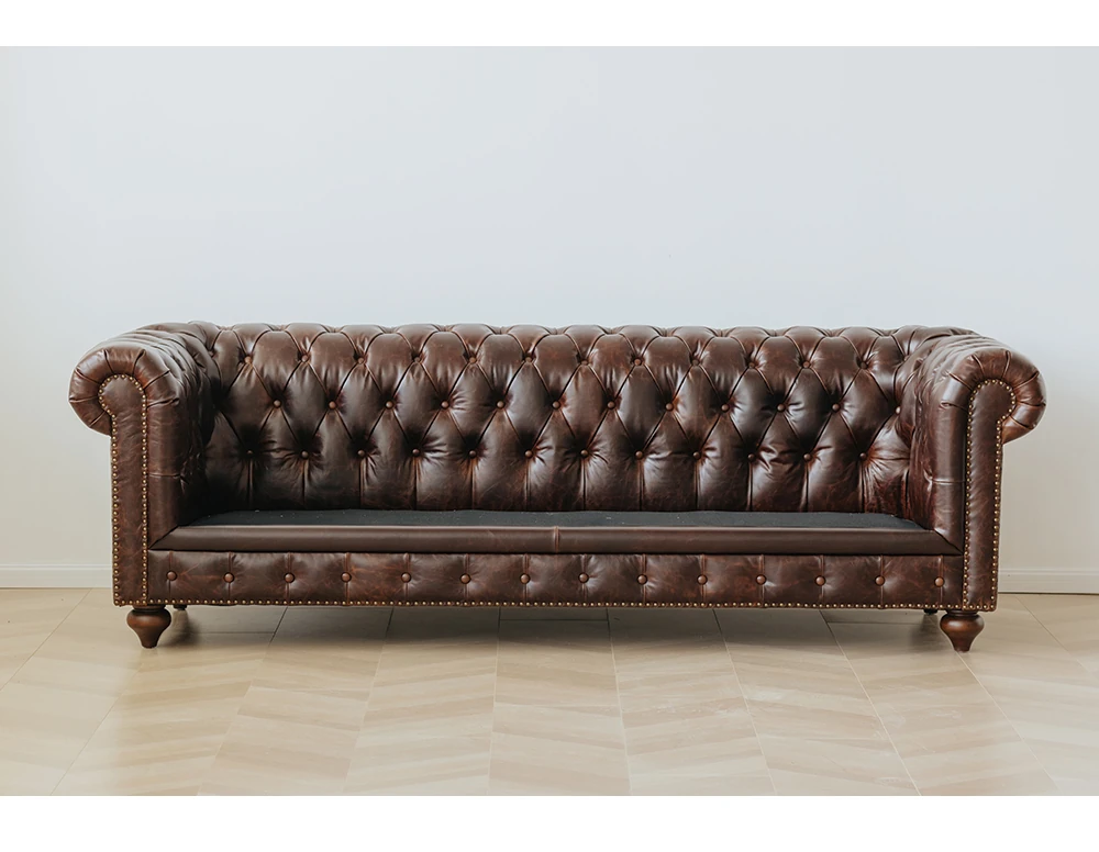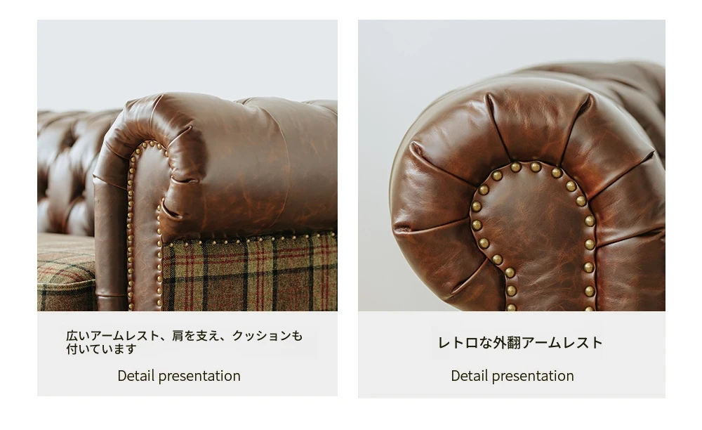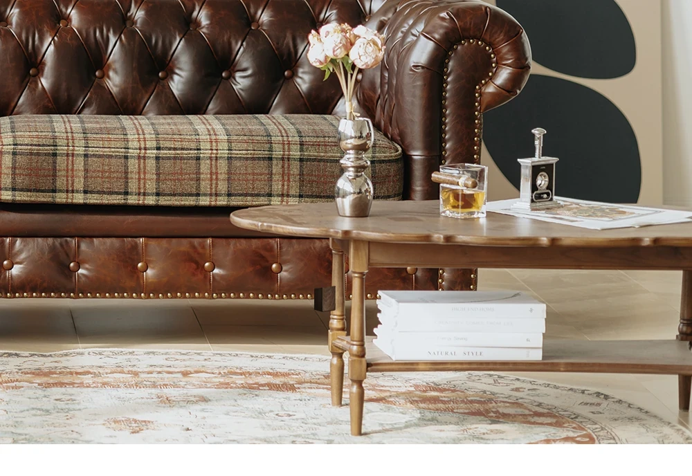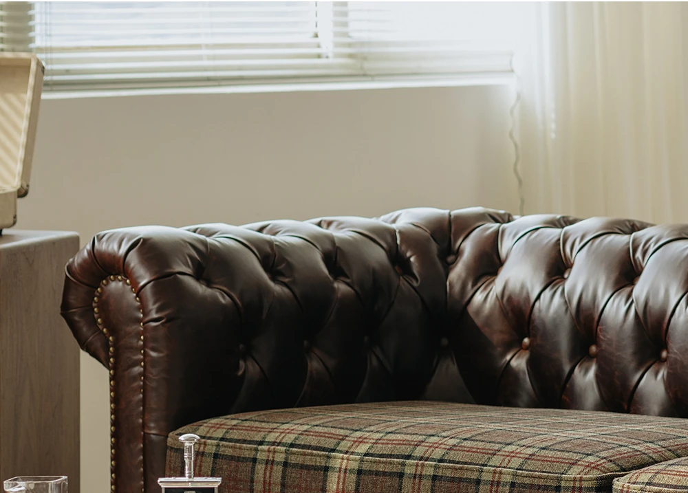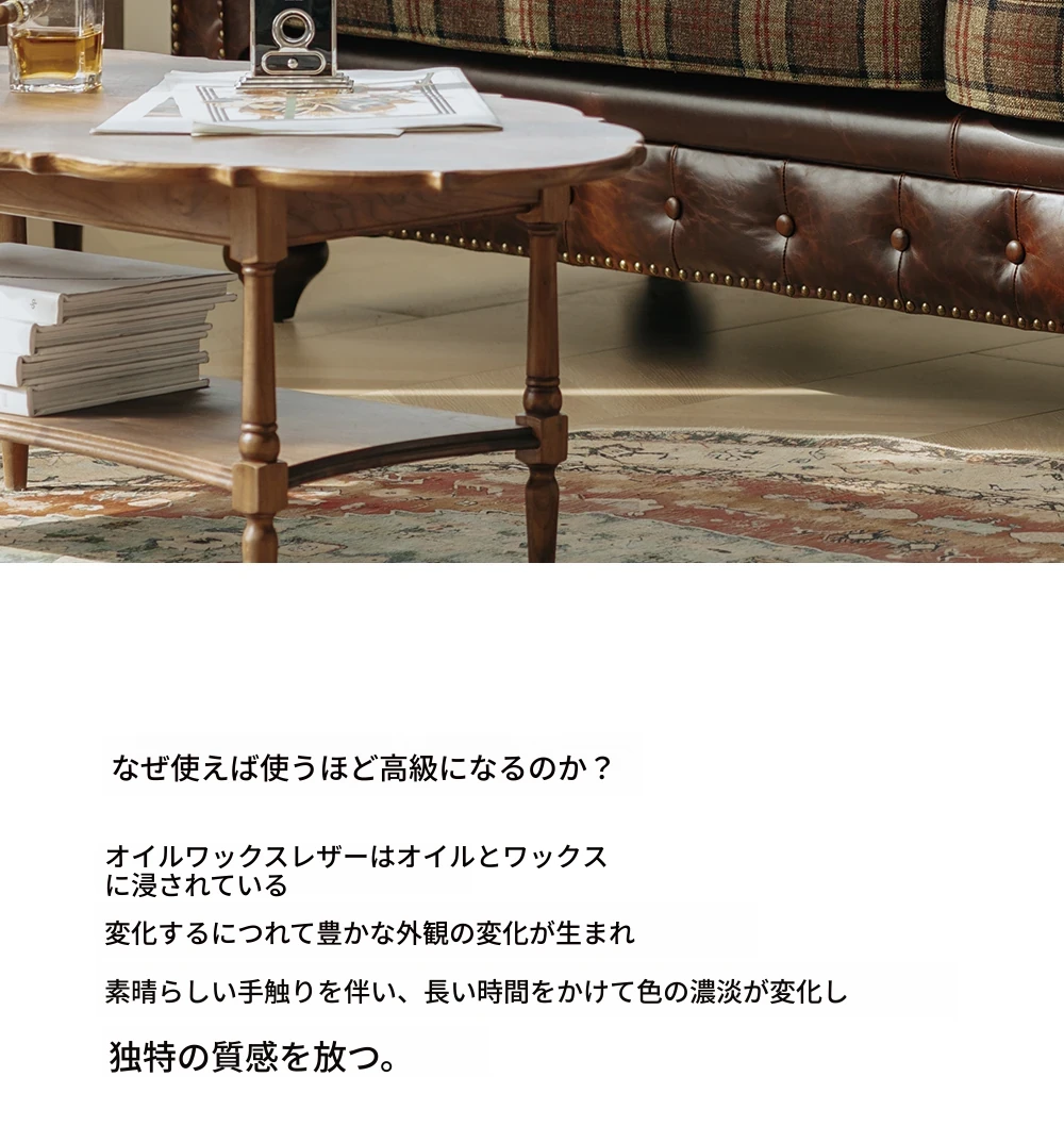 マンフィールドオイルワックスレザーソファー - ヴィンテージアメリカンスタイルの3人掛け本革ソファー、クラシックなイギリスのチェック柄でおしゃれなリビングにぴったり!