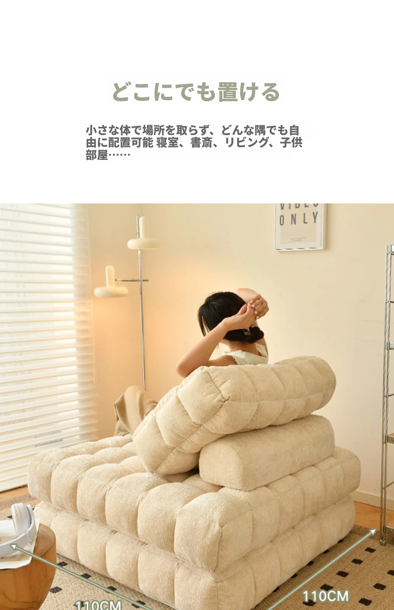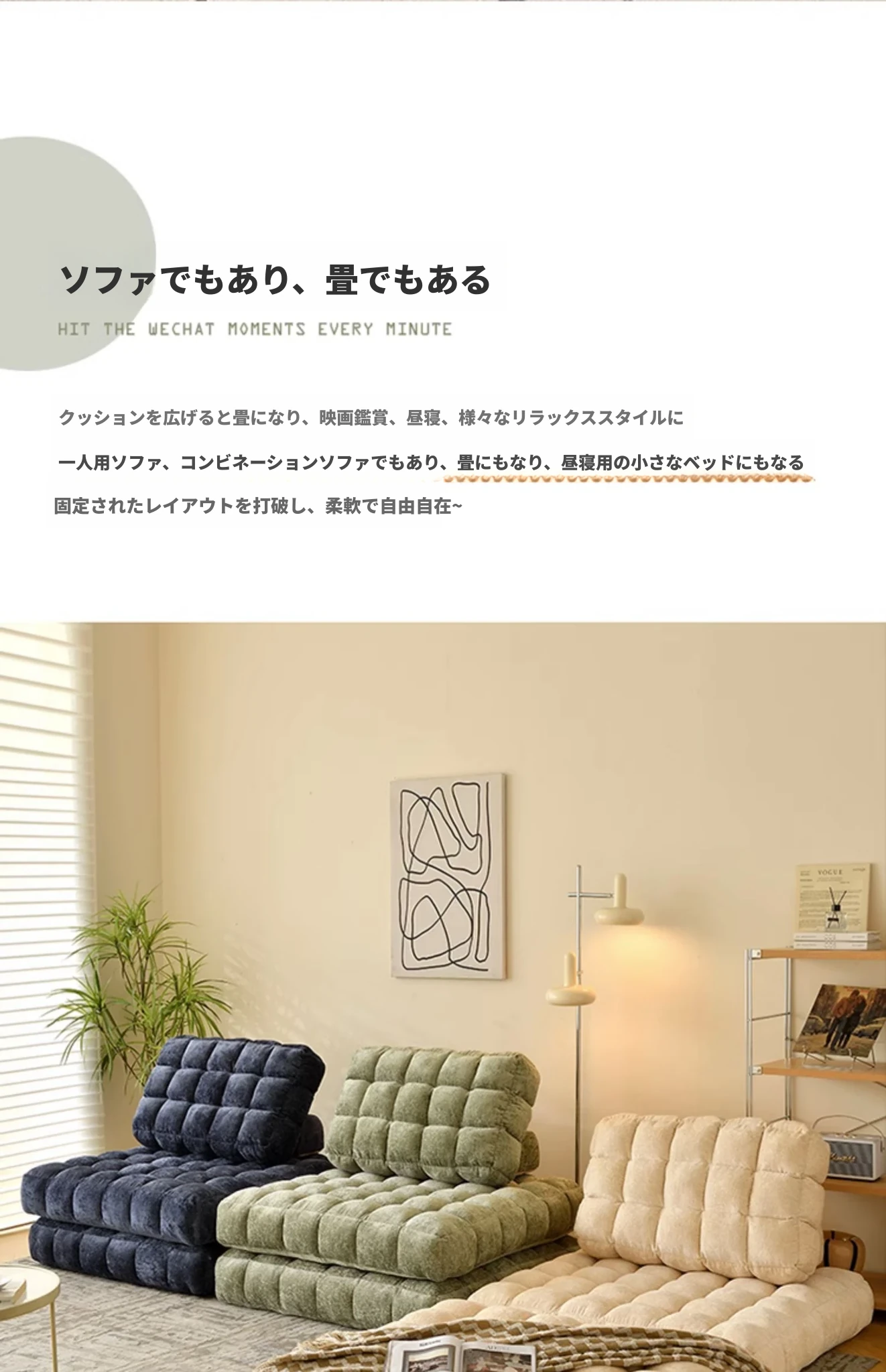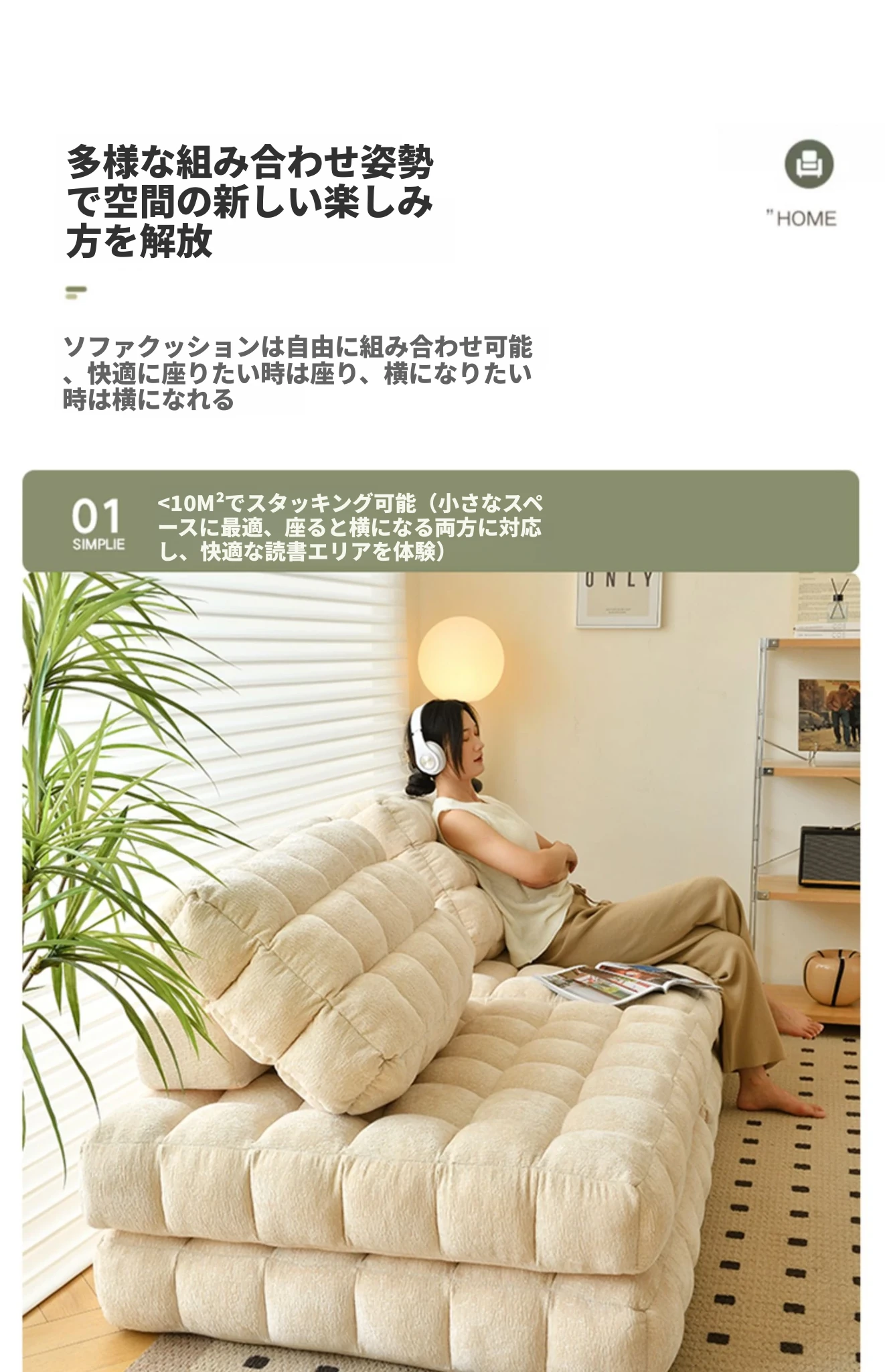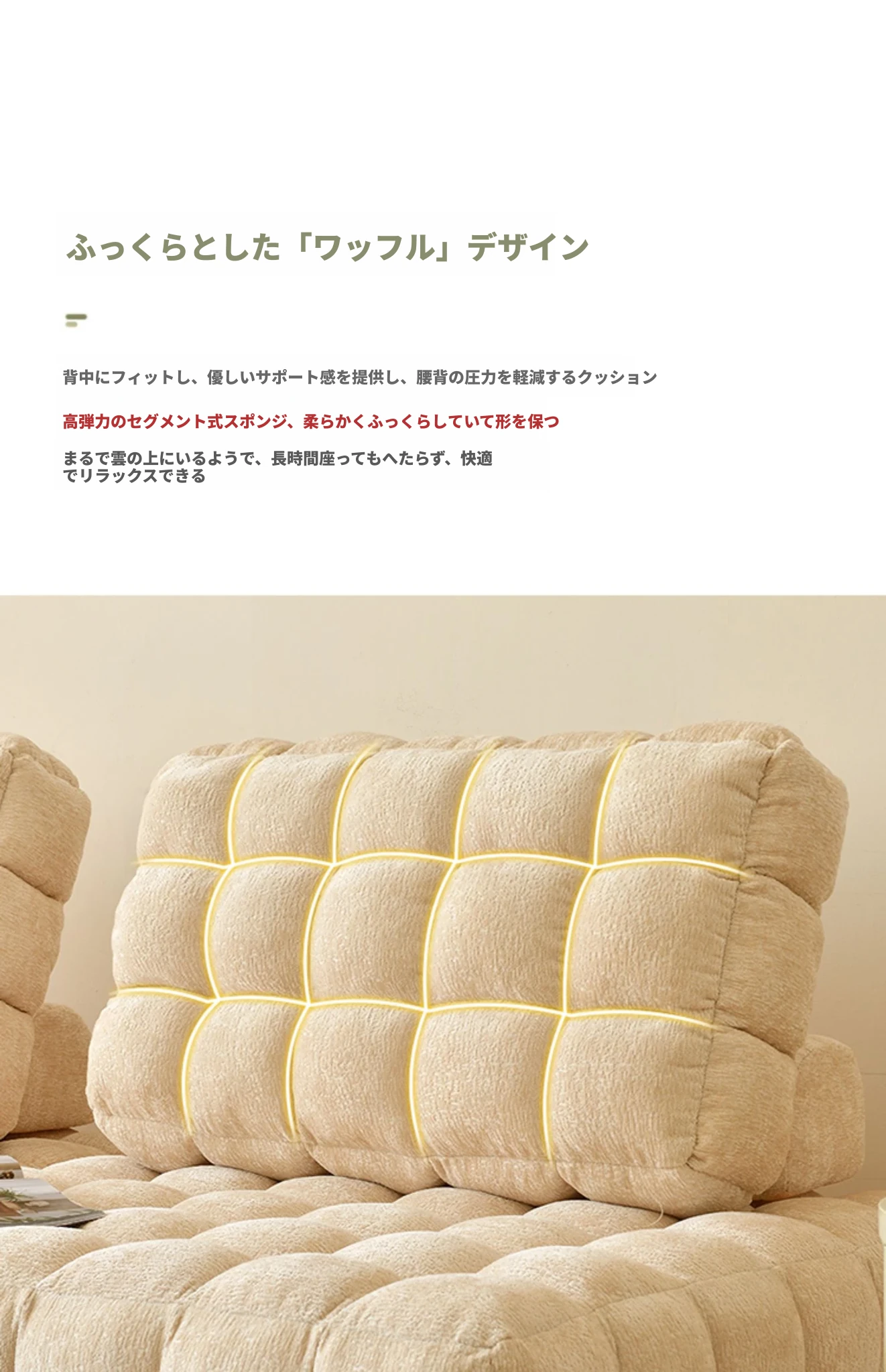シンプルでおしゃれなワッフル生地のリラックスソファ!リビングにぴったりな豆腐型モジュール、寝転がったり、くつろいだりできるタタミスタイル。クリーミーな風合いで、心地よいひとときを提供します!
