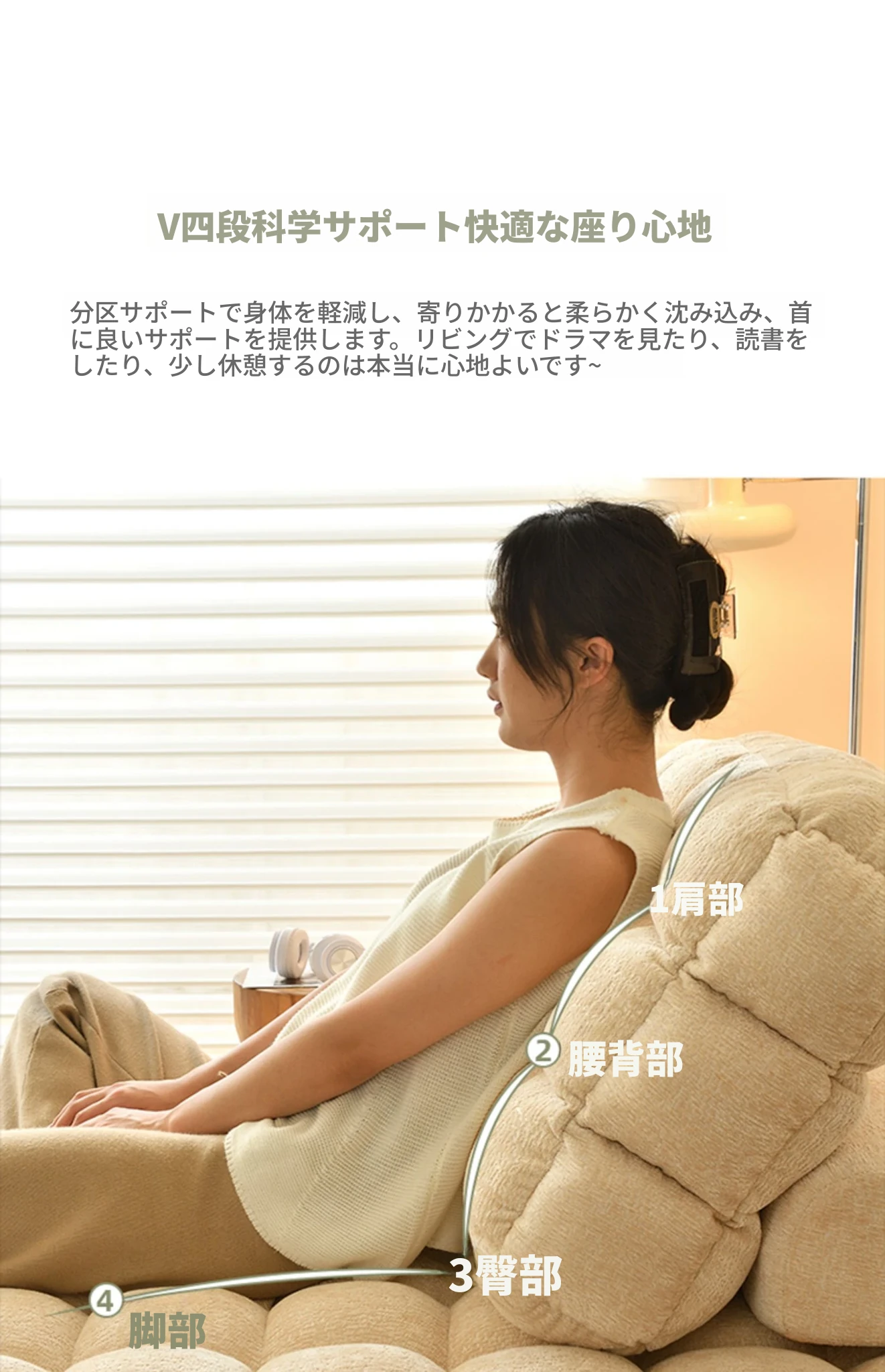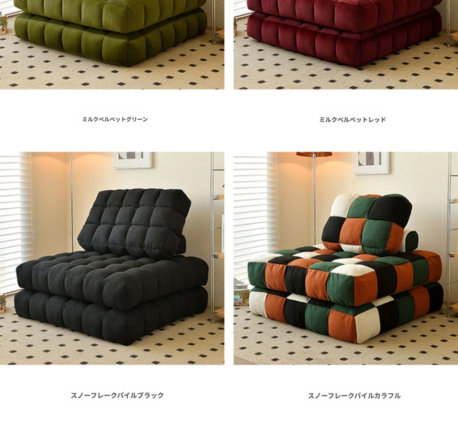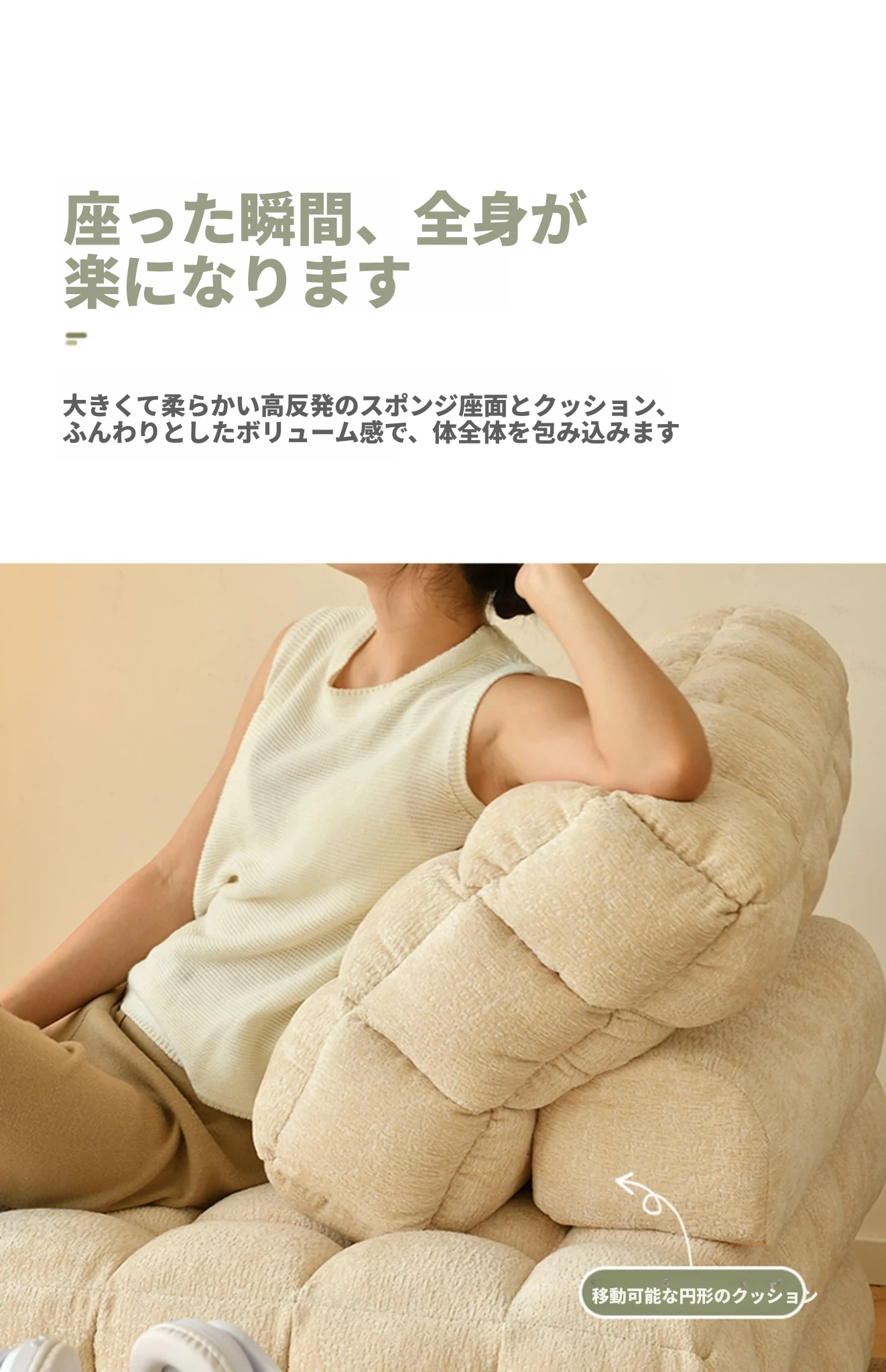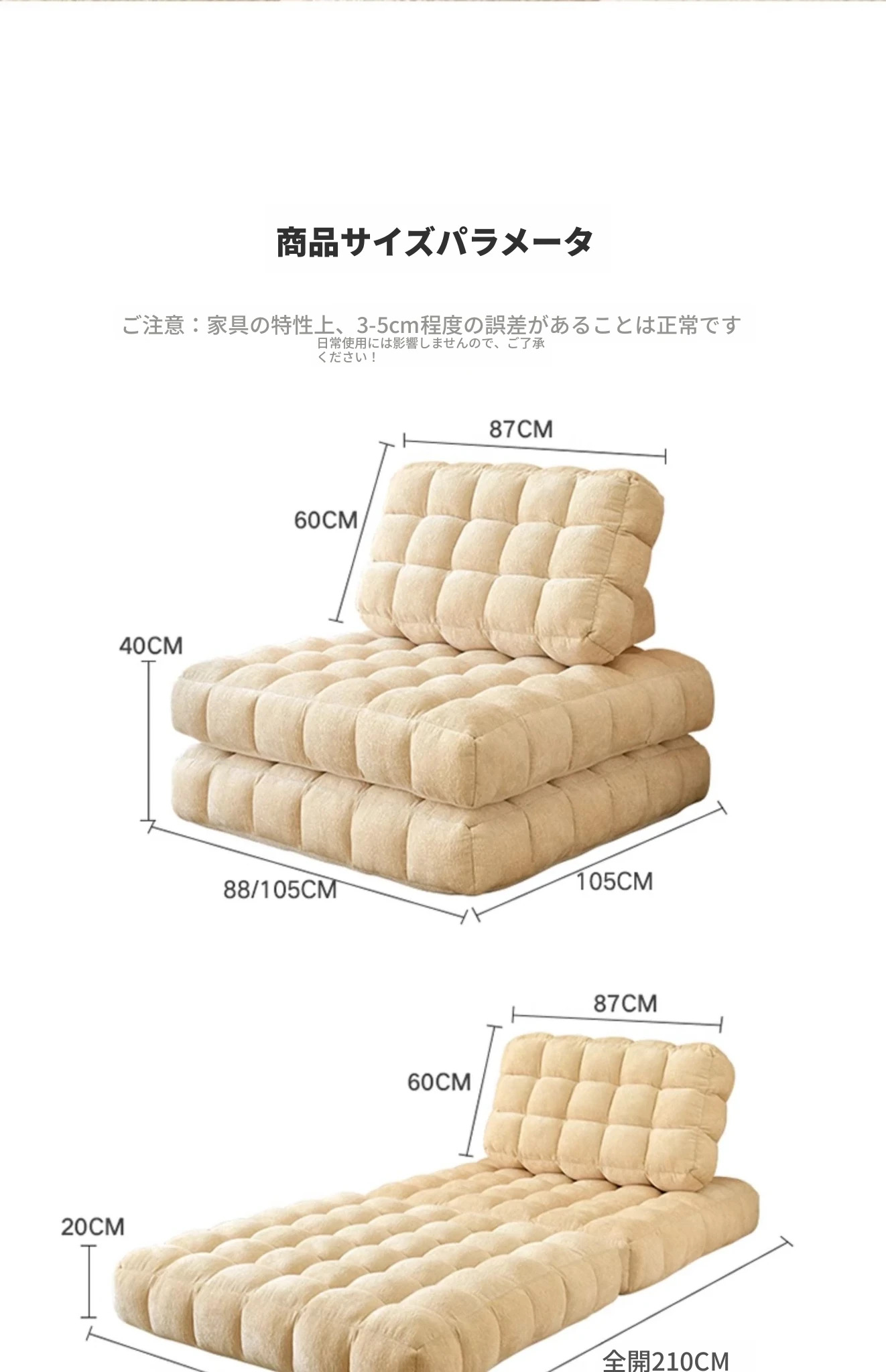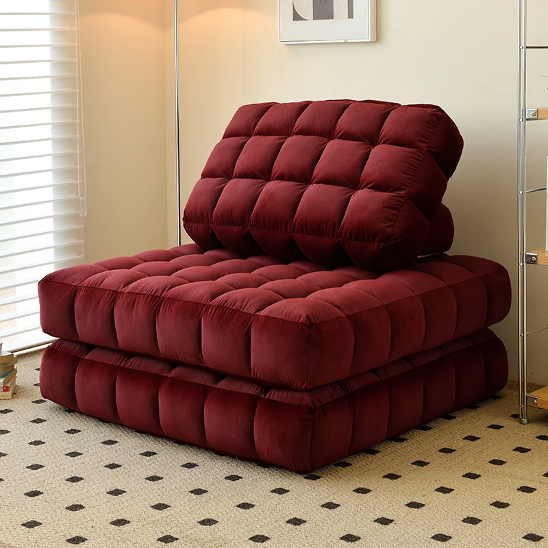 シンプルでおしゃれなワッフル生地のリラックスソファ!リビングにぴったりな豆腐型モジュール、寝転がったり、くつろいだりできるタタミスタイル。クリーミーな風合いで、心地よいひとときを提供します!
