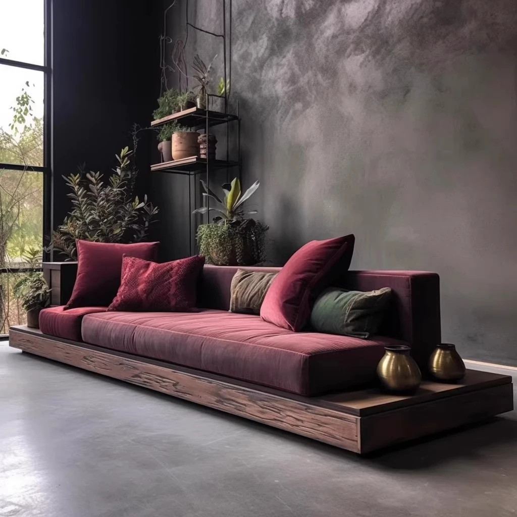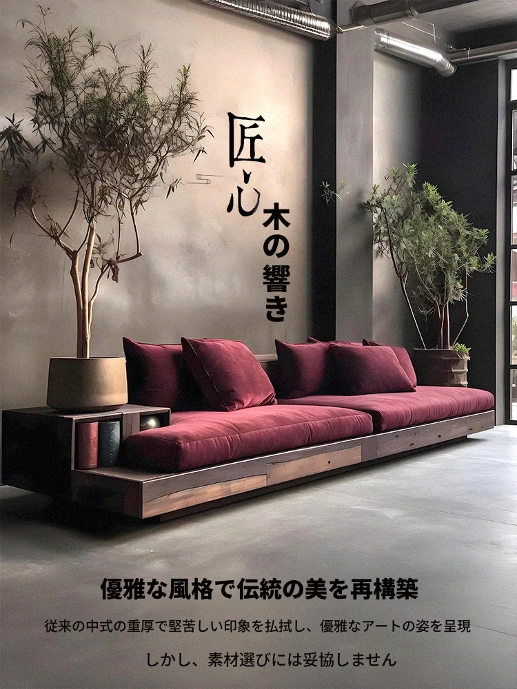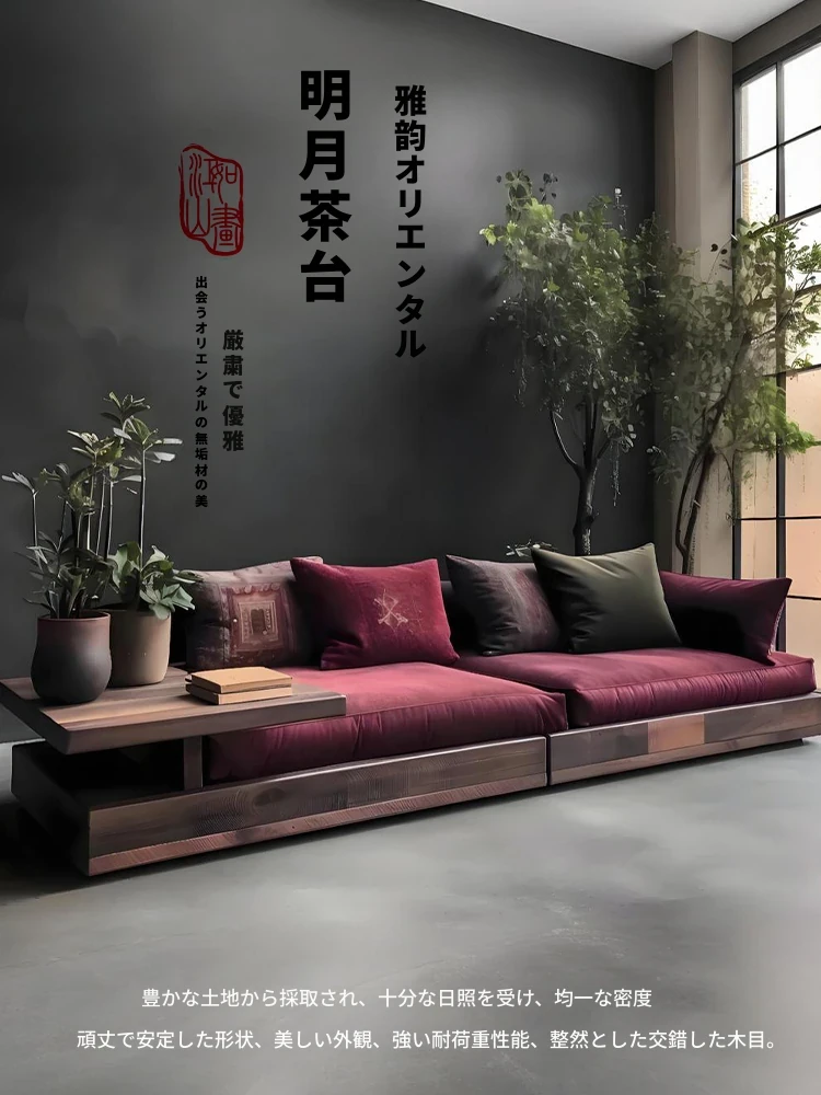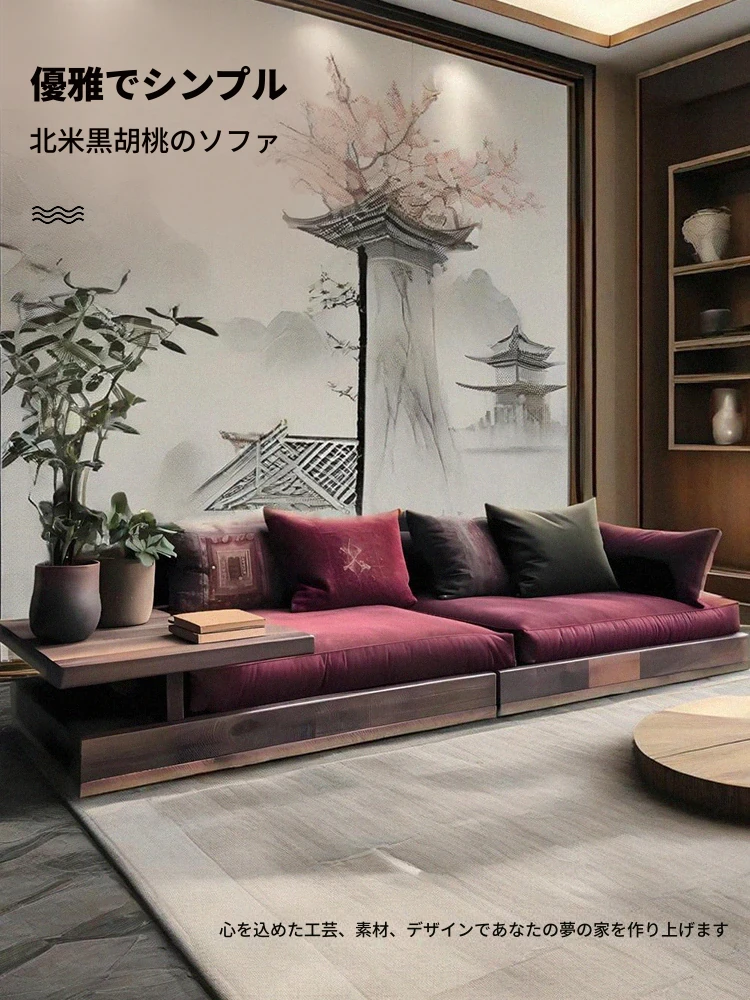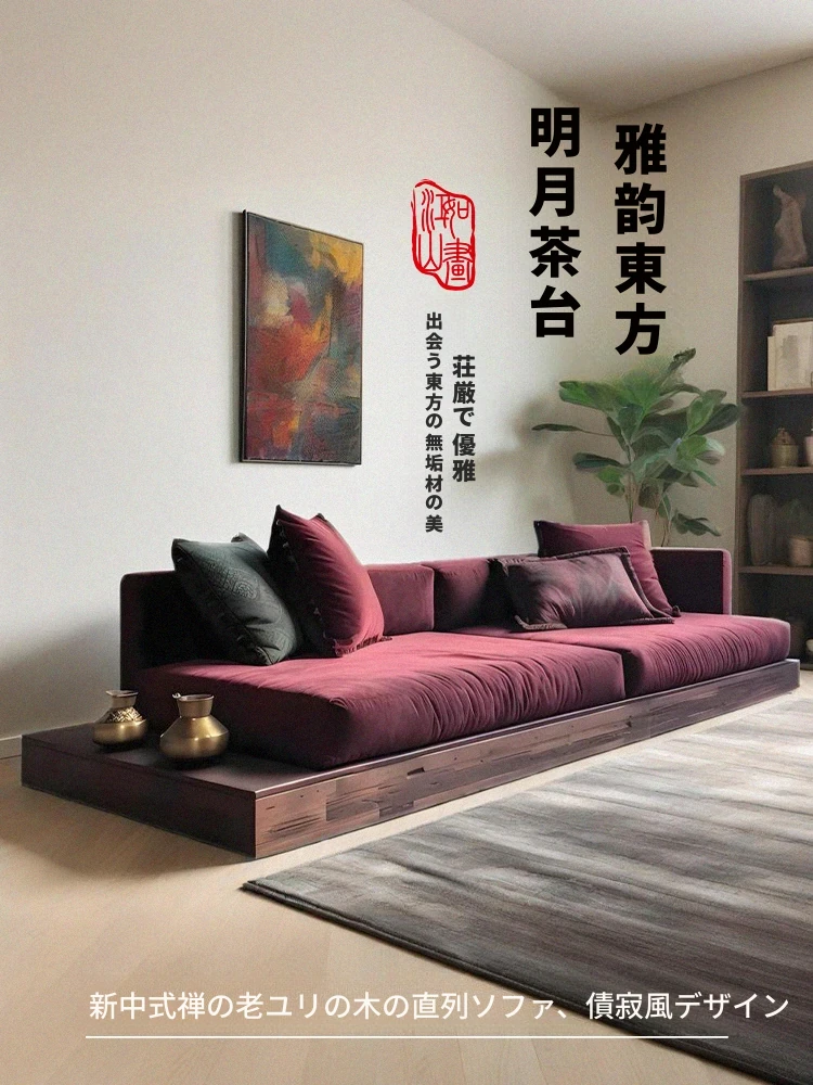 新中式の侘び寂び風レトロ無垢材ソファ|直置き・休憩スペース・接客用・茶室・会議用・民宿・ホテル・オフィスに最適!心落ち着く和の空間を演出します。
